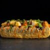 Tepamas sūris, tempura krevetė, agurkas, karai padažas, ikrai, svogūnų laiškai.
