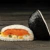 Lašiša, tepamas sūris, karai padažas, agurkai, tempura traškučiai.